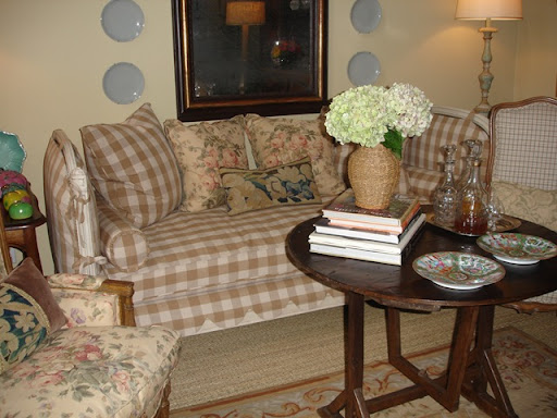 When Katrina devastated New Orleans, Antique store owner Tara Shaw was stuck without a place to sell her new shipment. Tara owns the eponymous Tara Shaw where she sells French, Italian and Swedish antiques to the trade only. Really. No cheaters - its the real thing. She came to Houston to open a new store and took Houston by a storm, which is probably a bad choice of words, considering. Everyone in the design business went crazy at her prices - they were unbelievably low - honest, true, trade prices - something Houston had never seen before. Of course, I had to get in on the fun. Loaded down by a commission check, I bought a buffet a deux for my living room from Tara and promptly filled it up with Masonware from England. The new antique piece towered over my poor little pincushion of a sofa. So, one day, I spied a green antique French daybed at Tara's. I had it painted Swedish gray, but instead it came out lavender and Don from Custom Creations saved the day when he repainted it a whitish taupe-y color for me. Ceci, also from Custom Creations, made the slipcovers for the daybed, again with a scalloped hem. The pincushion was banished to my master bedroom, replacing the Pottery Barn chairs up there. Finally, after 14 years in our house, I had a living room with a sofa (sort of) that fit the room properly. So, I was through with that room! Finished. Happy......