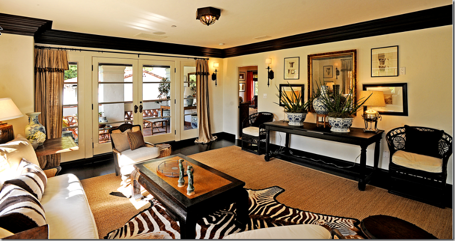 The upstairs family room is white, black and beige, again – with zebra and blue & white accents. The blue and white porcelains are a running them throughout the house. Symmetry symmetry.
