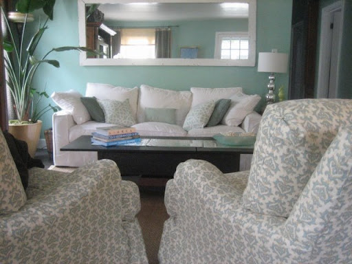 We'll open presents in Megan's living room with its beachy aqua walls and beautiful aqua linen slipcovered chairs. I love this room!