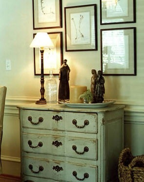 Original Home: converted light fixture, slipcovered French chairs, large hutch with a collection of brown and white transferware. This muted, monotoned look with honey colored woods is typical of a Barber design.